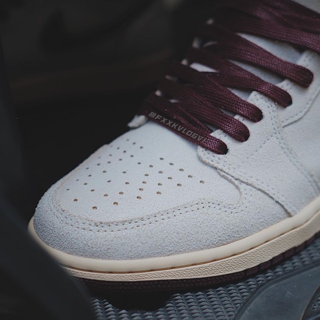 The pair features a predominantly sail crackled leather upper with burgundy hits applied to the ankle collar, quilted sock liner, and Swoosh branding on the sides. Confirming the tie-in between the two entities is the co-branded tongue tag and on the footbed.