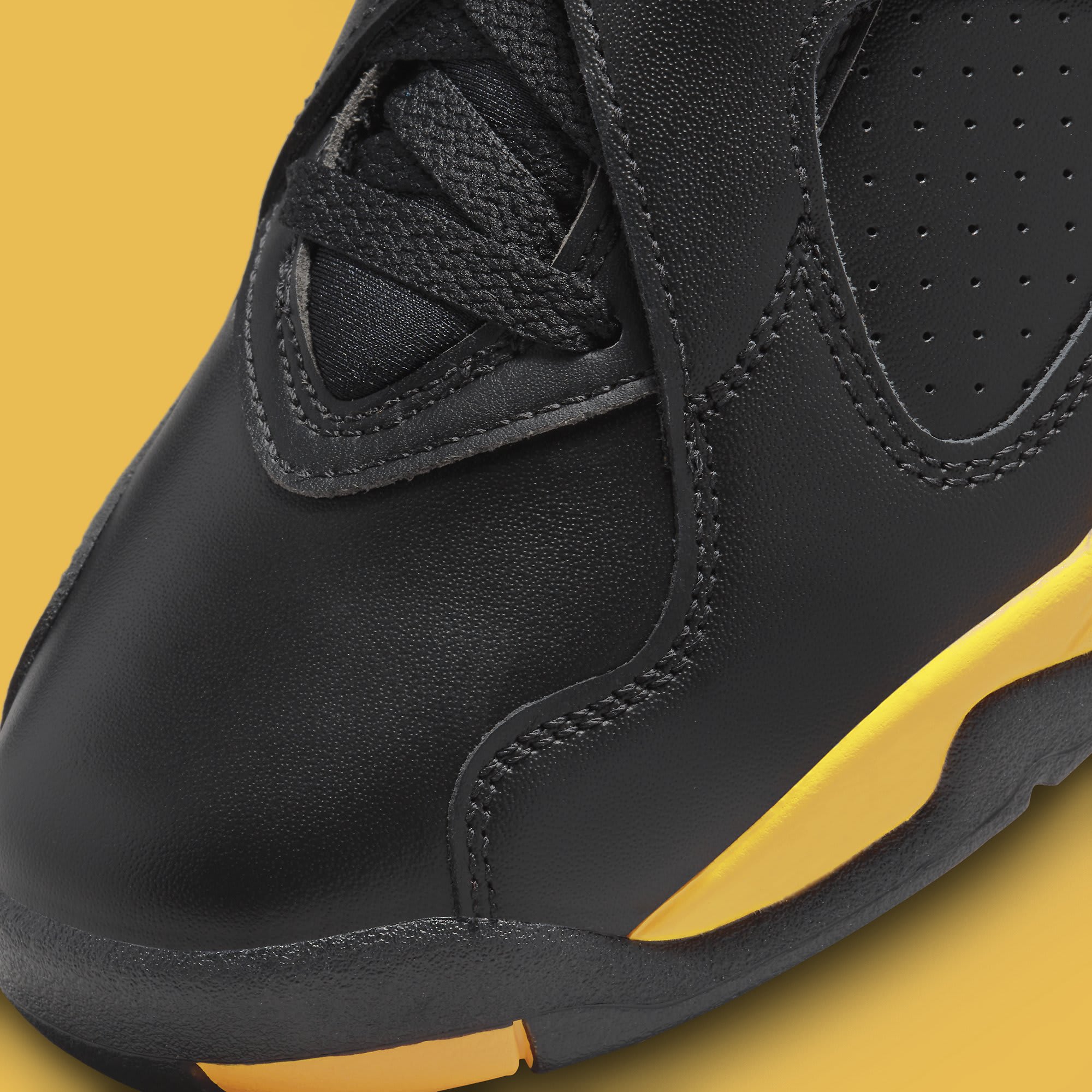 This women’s exclusive Air Jordan 8 dons a “Taxi/Opti-Yellow” color scheme and uses a black-based leather upper accented with two different shades of yellow through. The brighter Opti-Yellow fills in a portion of the accent colors including the background of the chenille Jumpman logo, while the gold-like Taxi makes up the majority of the hits.