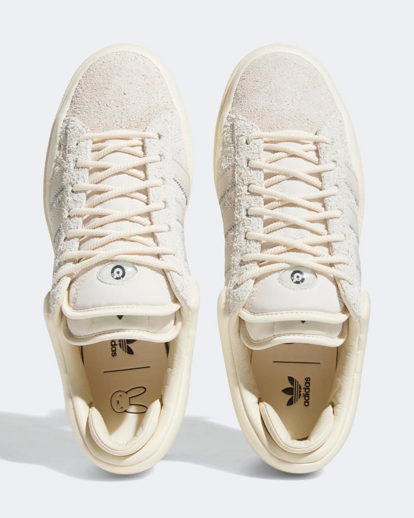Official product images of the Bad Bunny x Adidas Campus have loaded on the backend of Adidas’ website. The sneaker wears a muted color scheme, with a sail shade covering the entirety of the collab. The Campus collab, like previous Bad Bunny x Adidas shoes, has a dual tongue and extra panels on the ankle collar. Bad Bunny’s signature “Eye” logo appears on the tongue tag while co-branding appears on the accompanying dust bag.