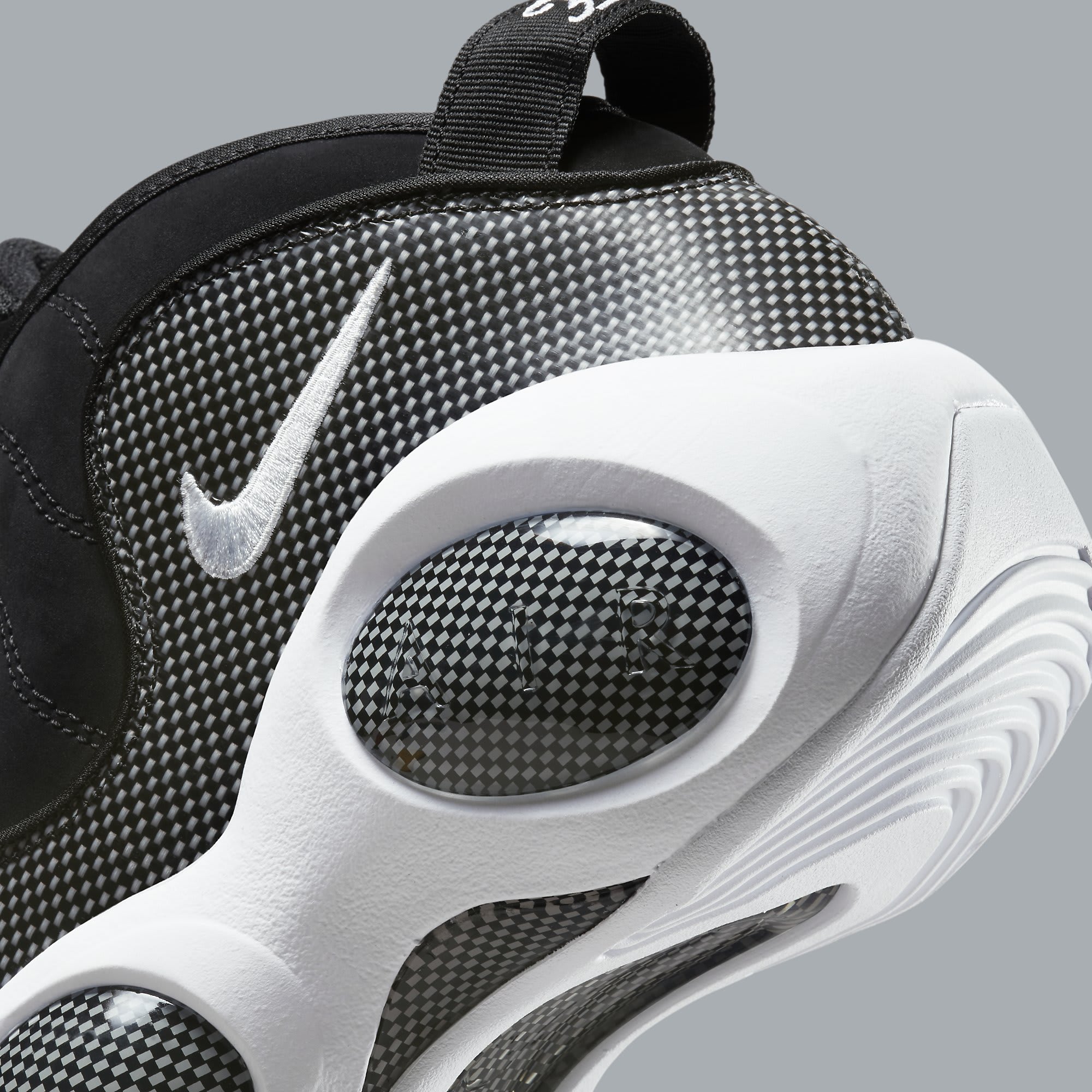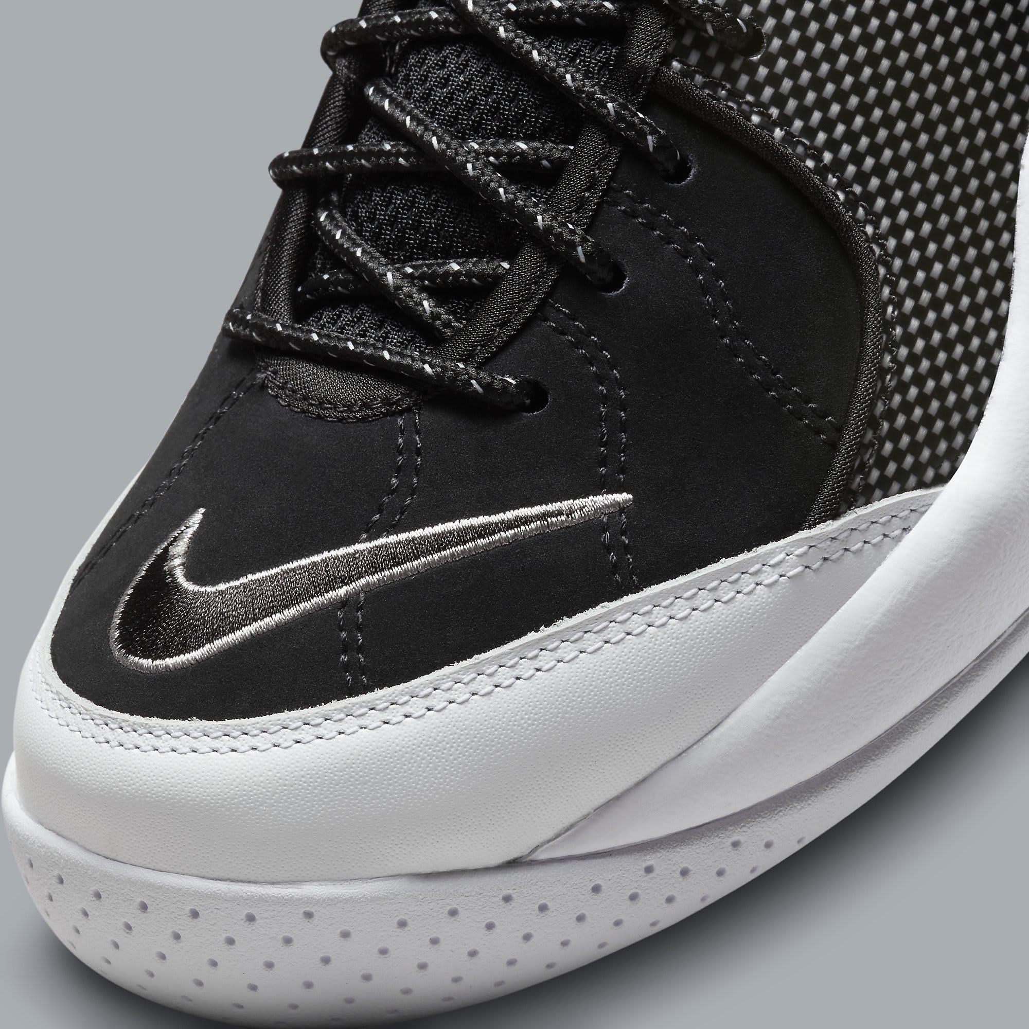 Up first, the original “Black Metallic” colorway, which wasn’t Kidd’s go-to pair on the court, but was a fixture in the streets and school hallways. Wavy black nubuck is the backdrop for contrasting carbon fiber overlays and a large outlined Swoosh on the toe. All of that was offset by a solid white leather toe overlay and white rubber sole.