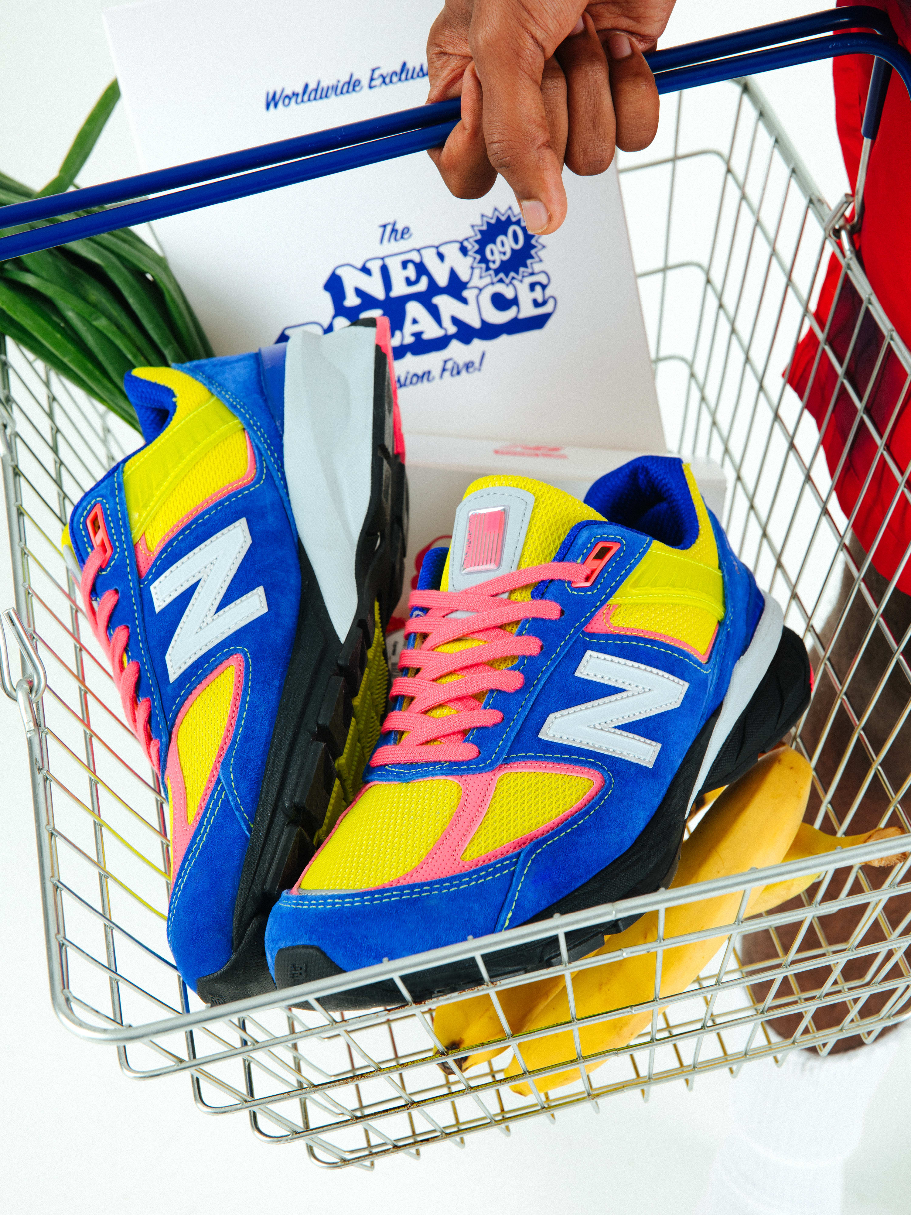 Taking inspiration from 80s era British corner shops and the pop art frequently found within, the shoes feature a vibrant palette of blue, yellow and pink. Royal Blue suede, yellow mesh and pink nubuck are slightly counterbalanced by grey detailing and a black sole.