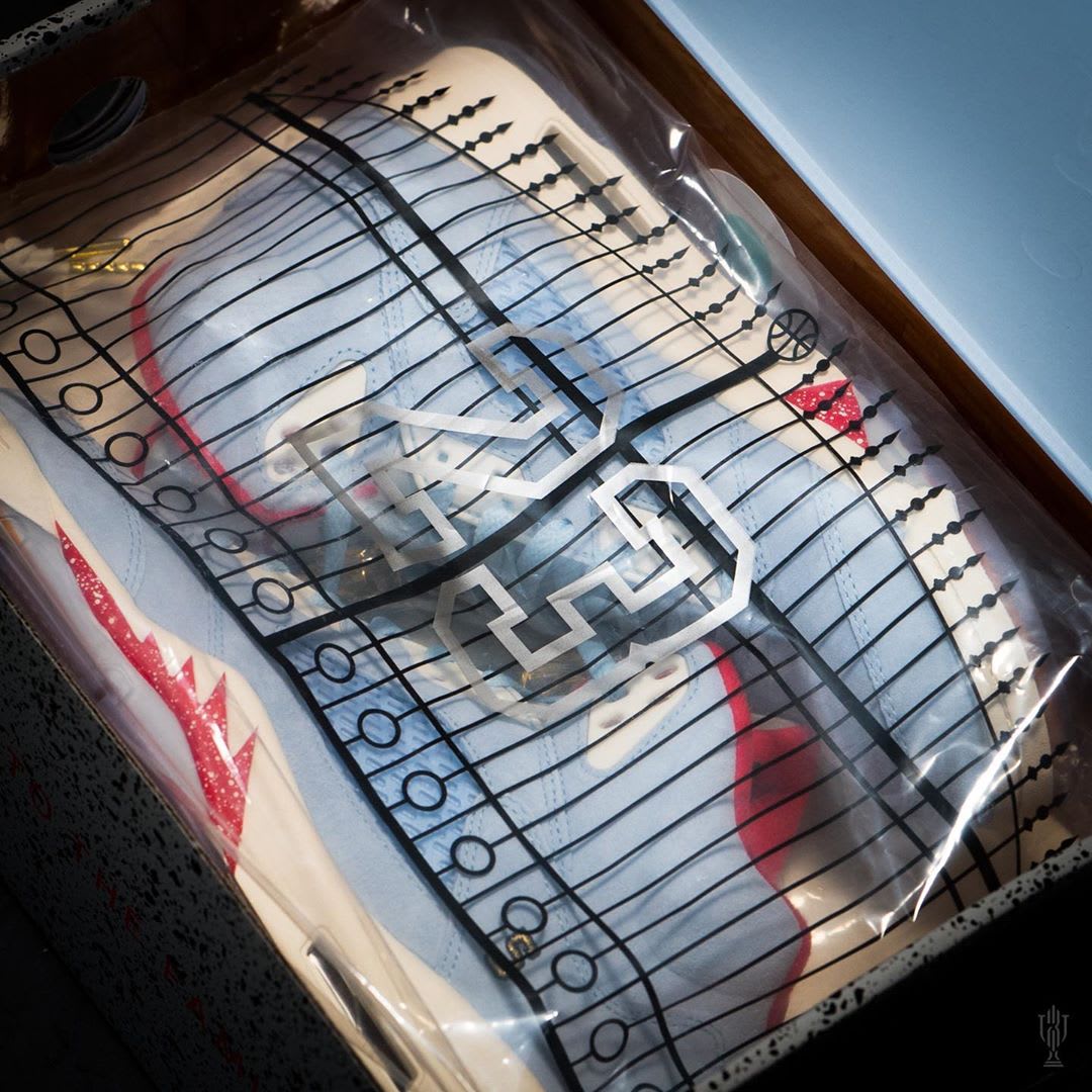 UPDATE (12/1): Thanks to @py_rates on Twitter, new information surrounding the rumored Trophy Room x Air Jordan 5 release has surfaced including a mock-up of a retail version and a “Friends & Family” exclusive dressed in “Ice Blue/Sail/Metallic Gold/ University Red and “University Red/Ice Blue/Sail/University Red” respectively. The pairs are still rumored to release sometime in Spring of 2019.